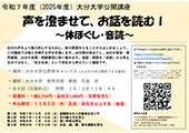 この講座では場と共鳴する声を目指します。20分間の体ほぐし、20分の発音・発声練習、35分の音読・朗読練習に取り組みます。 開催日時 【第1回】令和7年12月02日(火)「股関節まわりの筋肉をほぐす」 【第2回】令和7年12月16日(火)「舌の鍛え方を学ぶ」 【第3回】令和8年01月06日(火)「深い呼吸を探る」 【第4回】令和8年01月20日(火)「足首、膝、腰、肩の連動を探る」 ※申込締切:11月5日(水) 開催時間 15:30~16:45 開催場所 大分大学旦野原キャンパス 対象・受講料 高校生以上8名(抽選) 一般2,724円・高校生1,000円(税込) 問い合わせ 大分大学教育マネジメント機構基盤教育センター (事務担当:学生支援部 教育支援課) TEL:097-554-7641(受付:平日9時~17時) E-mail:kyokikss◎oita-u.ac.jp(◎は@に置き換えてください) HP:https://www.he.oita-u.ac.jp/ ▶ 詳細はこちら |