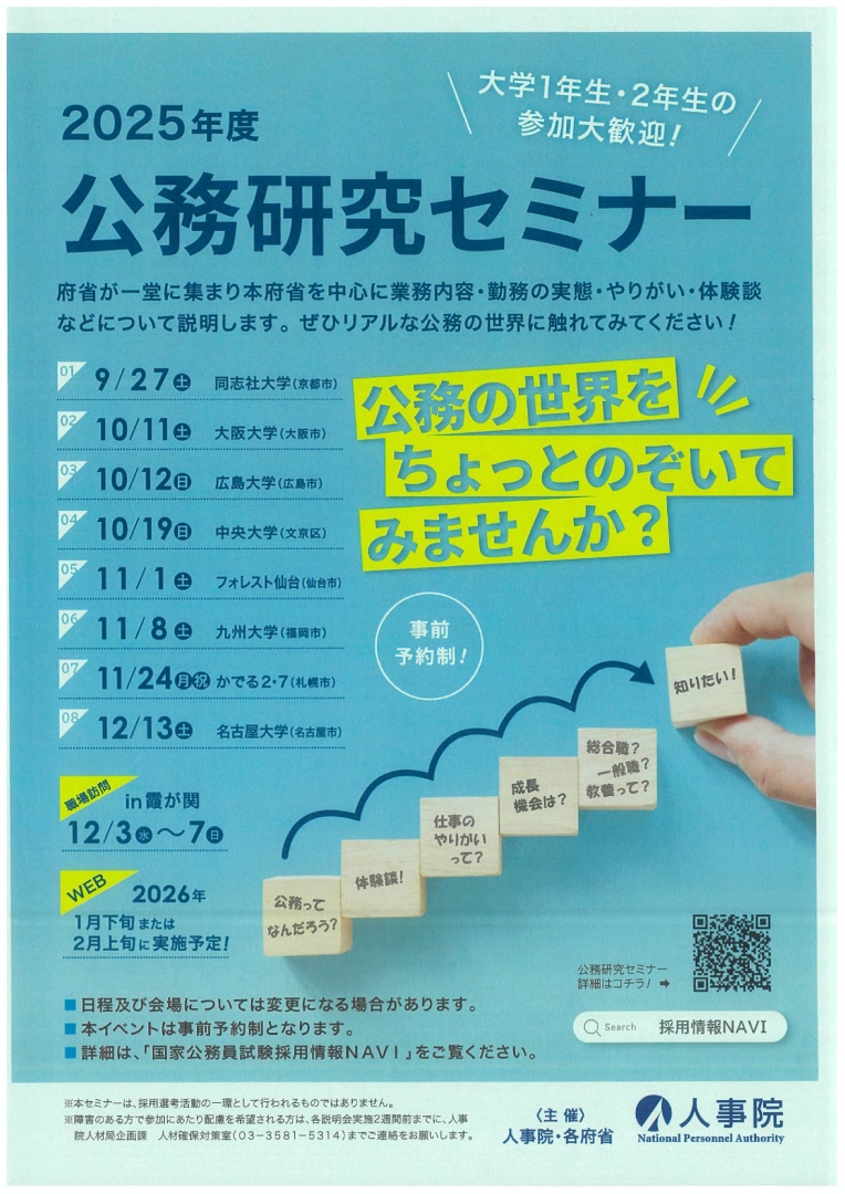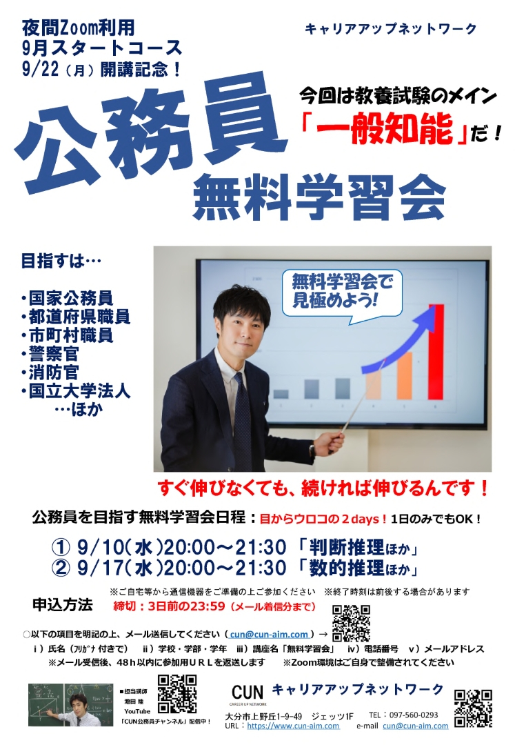 CUN 公務員無料学習会…9/10・17(3日前〆) (詳細はポスター画像をご確認ください) |