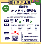 熊本県庁主催 職種別オンライン説明会…12/10-19(12/5〆) (詳細はポスター画像をご確認ください) |