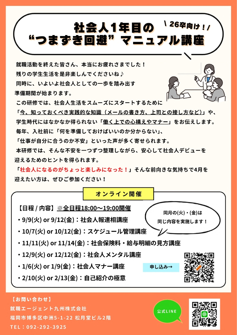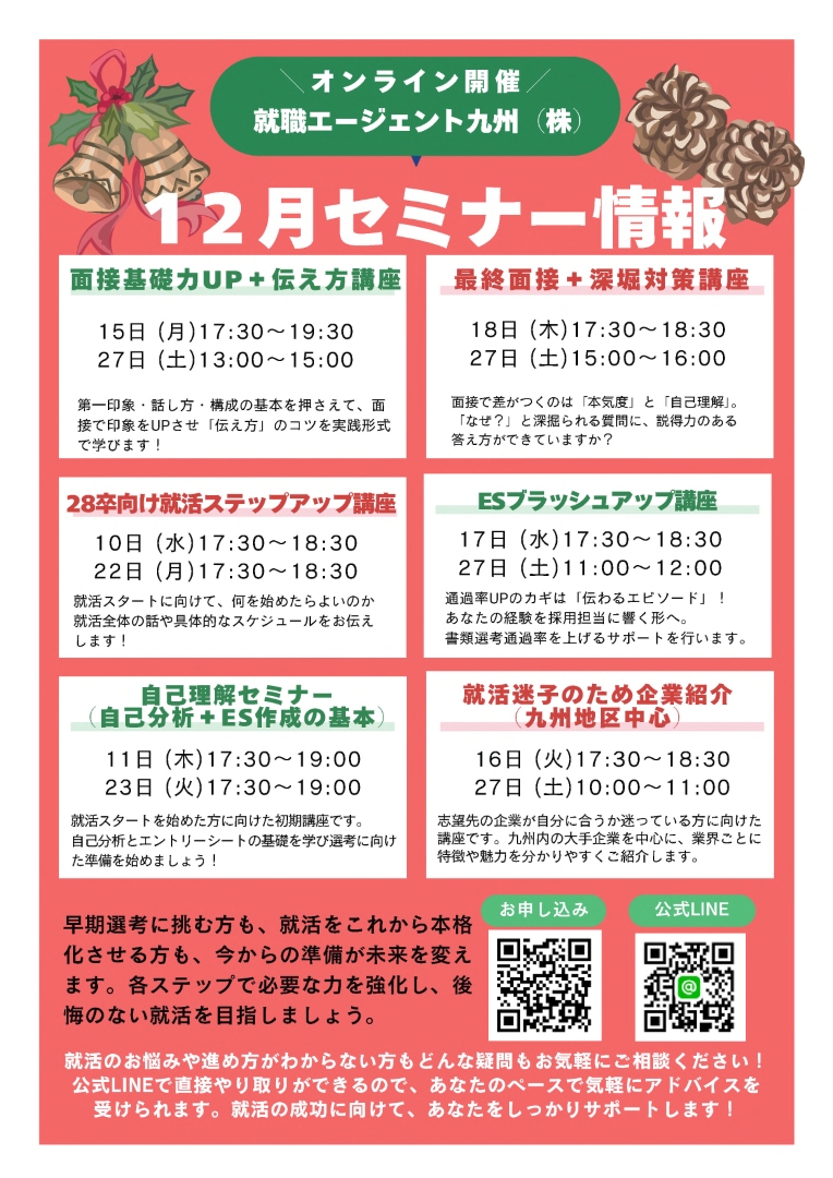 就職エージェント九州㈱ 就活セミナー…~12/27 (詳細はポスター画像をご確認ください) |