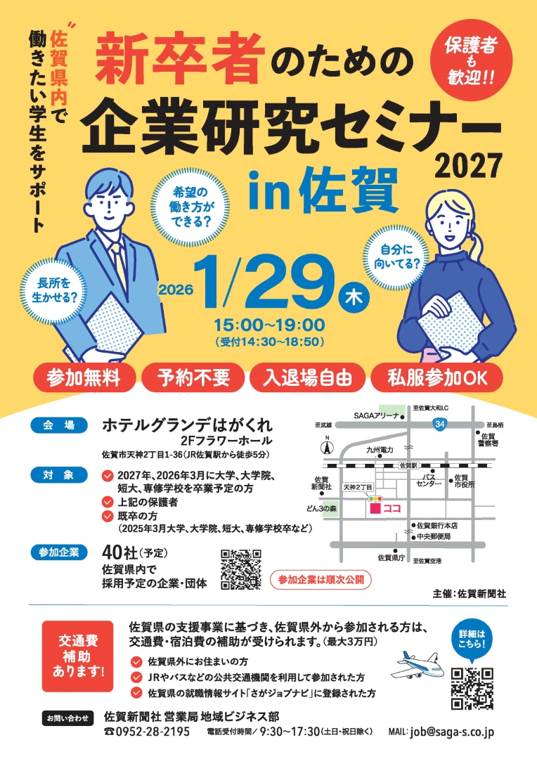 新卒者のための企業研究セミナー2027in佐賀…1/29 (詳細はポスター画像をご確認ください) |