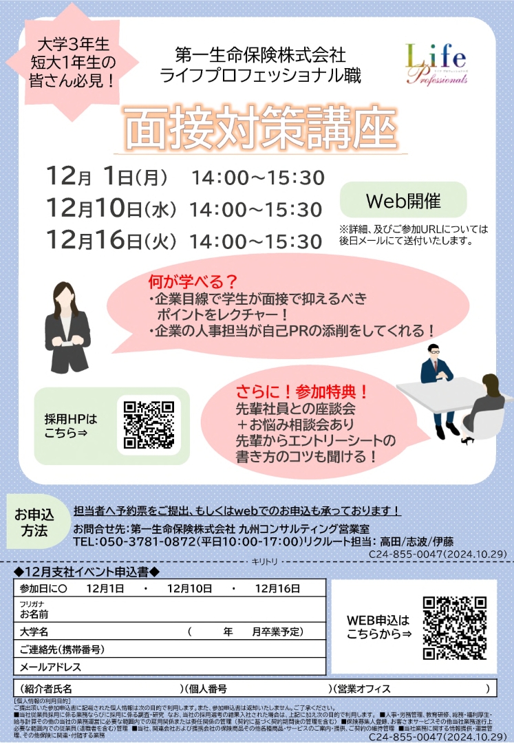 第一生命保険株式会社 ライフプロフェッショナル職 面接対策講座…~12/16 (詳細はポスター画像をご確認ください) |