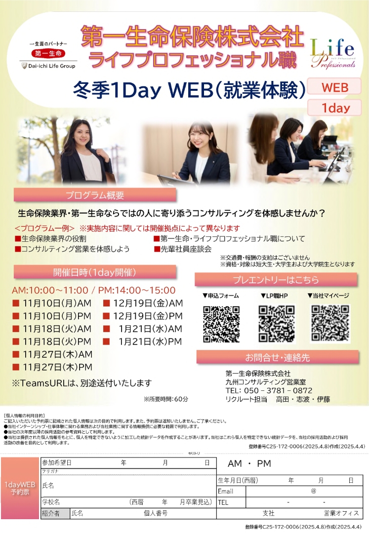 第一生命保険株式会社 ライフプロフェッショナル職 冬季1Day…~1/21 (詳細はポスター画像をご確認ください) |