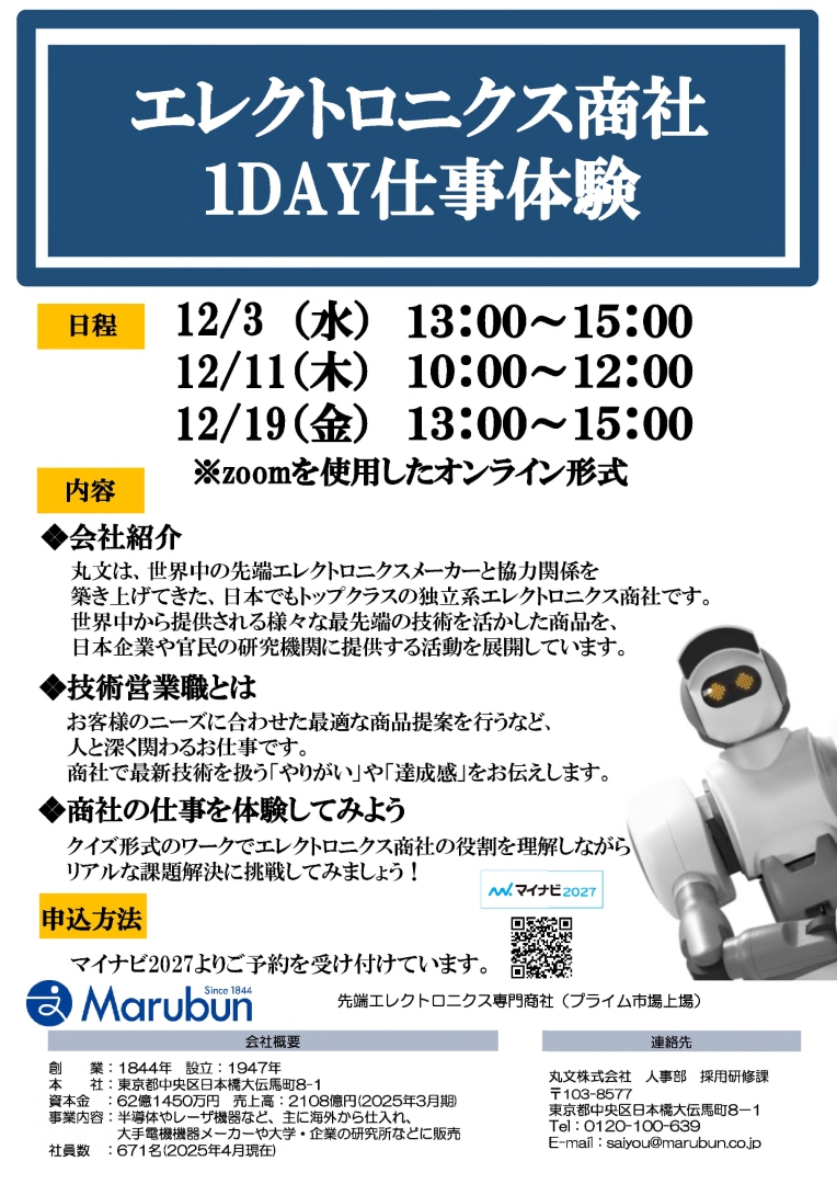 丸文株式会社 1DAY仕事体験…~12/19 (詳細はポスター画像をご確認ください) |