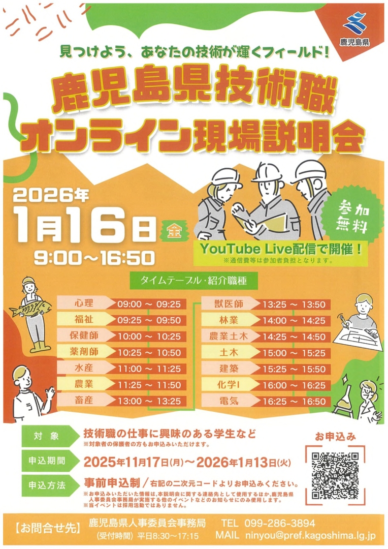 鹿児島県技術職オンライン現場説明会…1/16 (詳細はポスター画像をご確認ください) |
