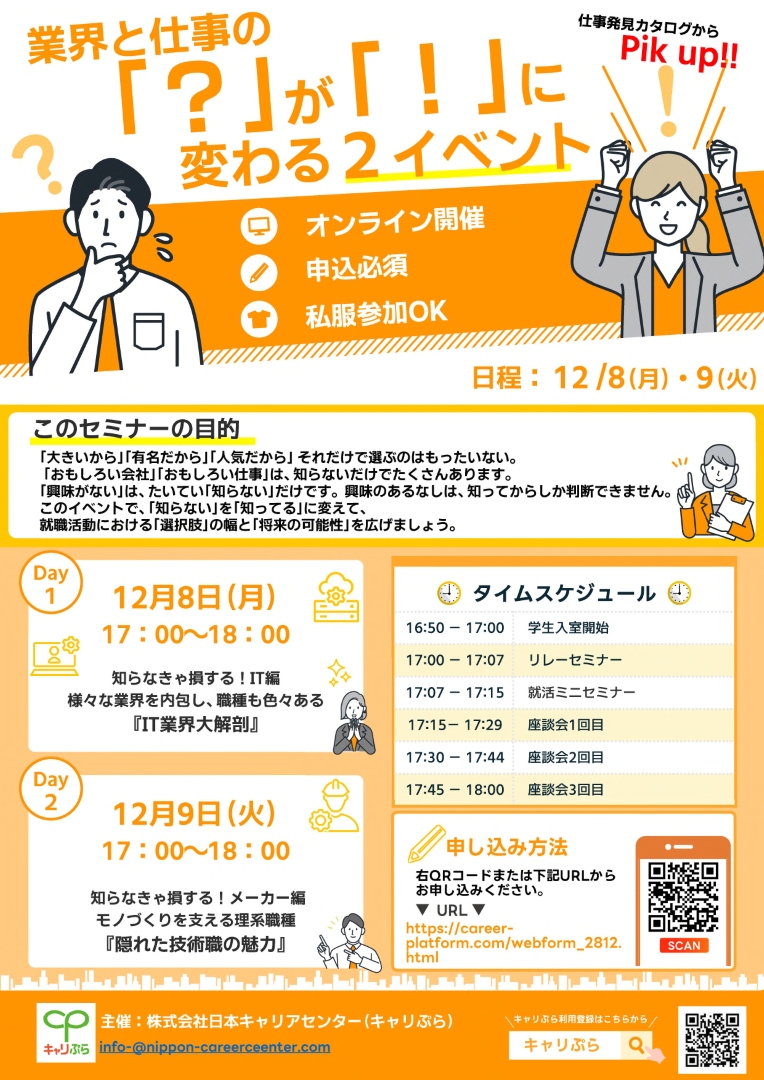 きゃりぷら 業界と仕事の[?」が「!」に変わる2イベント…12/8・9 (詳細はポスター画像をご確認ください) |