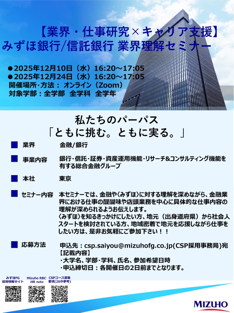【業界・仕事研究×キャリア支援】みずほ銀行/信託銀行 業界理解セミナー(キャリタスUC掲載) (詳細はキャリタスUCをご確認ください) |