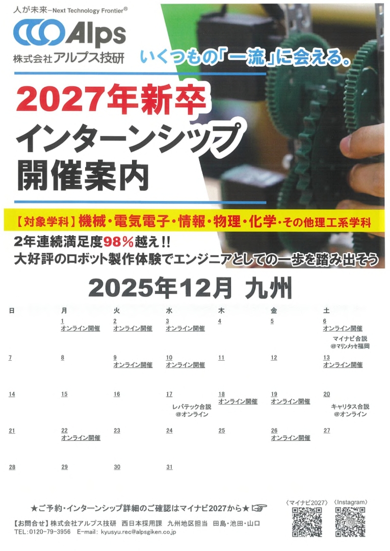 アルプス技研 インターンシップ開催案内…~12/26 (詳細はポスター画像をご確認ください) |