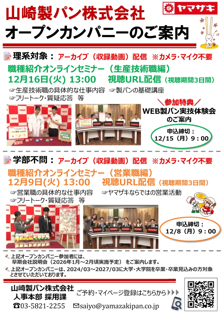 山崎製パン株式会社 オープンカンパニー…12/9・16 (詳細はポスター画像をご確認ください) |
