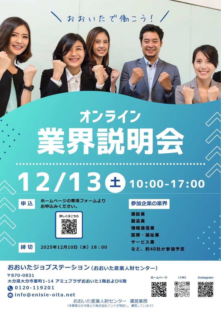おおいたジョブステーション オンライン業務説明会…12/13(12/10 18:00〆) (詳細はポスター画像をご確認ください) |