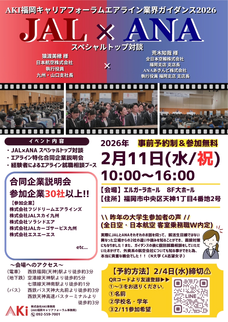 株式会社AKI 福岡キャリアフォーラムエアライン業界ガイダンス2026…2/11(2/4〆) (詳細はポスター画像をご確認ください) |
