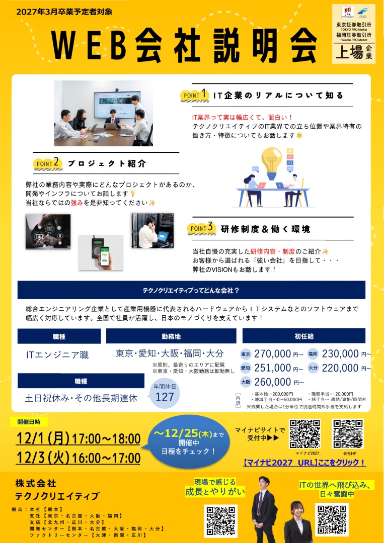 株式会社テクノクリエイティブ WEB会社説明会…~12/25 (詳細はポスター画像をご確認ください) |
